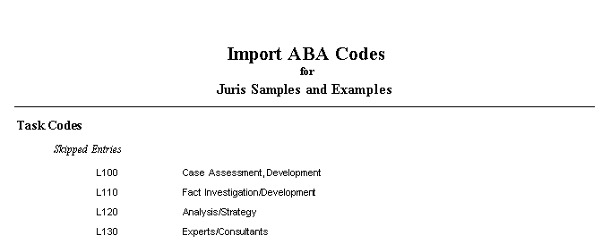 Once the import is complete, a report listing all the codes that were imported will automatically be displayed, like shown below. The codes are now available for use within Juris. To confirm the import, go to Tables and review Task Codes, Activity Codes and Expense Codes, whichever you chose to import.