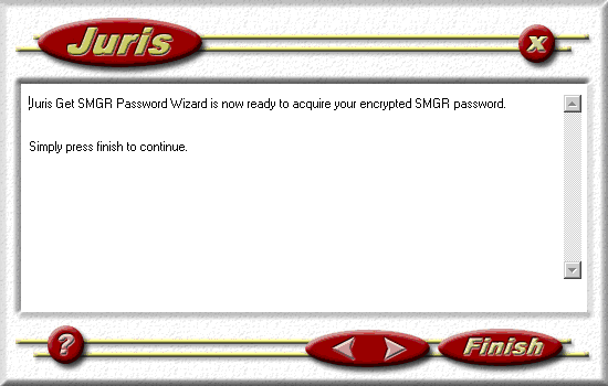 At this point you will be given a number – an encrypted version of the password. Give this number to someone in Juris Support and they will be able to decipher it for you. But before giving out the password, they will have to determine that the caller is the actual person who needs SMGR rights.