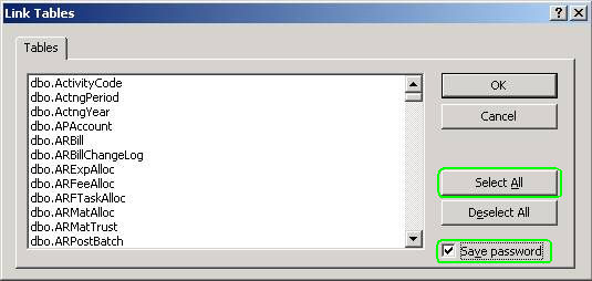 - The Link Tables box will display. Click SELECT ALL and place a check in the Save password box.