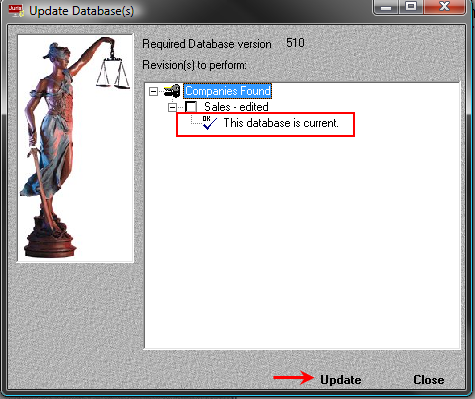 - If a message indicates the database requires an update, a list the applicable revisions shows below the company name. Place a checkmark beside the company name, then click Update to apply those revisions.