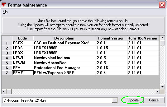 The Update button will quickly update BX formats that have been downloaded from www.juris.com. The user must save the downloaded formats into the JurisBX\formats directory for this function to be successful. After new formats have been downloaded and unzipped into the JurisBX\formats directory, click the Update button to import all new versions of current BX formats for use.