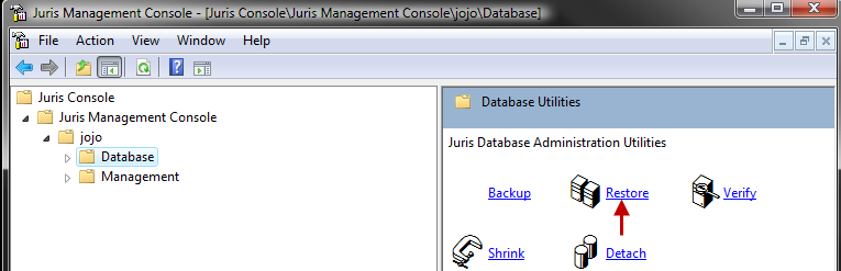 To begin the Restore utility, click the Restore link in the Juris Management Console.