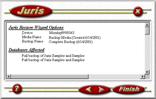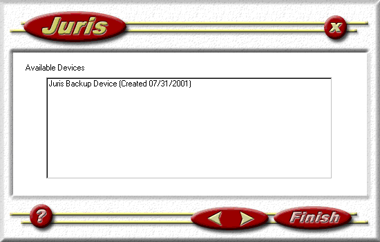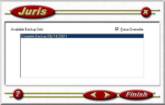 The Backup Sets available on the previously selected media device will be displayed. Highlight the appropriate backup set and click the forward arrow. Select the Force Overwrite option to overwrite the current Juris data.