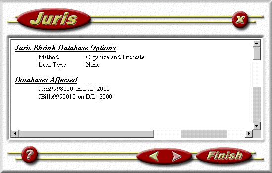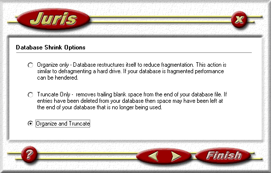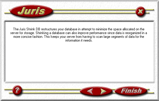 The Shrink utility decreases the size of the Juris® database and JBills. This also can improve the performance of your Juris system because data is reorganized in a more concise fashion. This will help your server from having to scan large of segments of data for the information it needs.