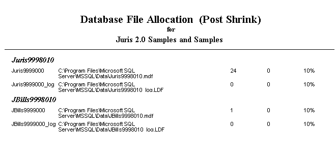 A report automatically displays at the end of the procedure. It contains information on the Juris database and also the JBills (archived bills) file when applicable. It may be printed if needed to be saved for record keeping.