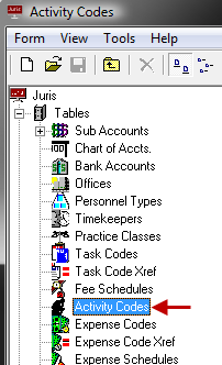 - Navigate to Activity Codes by selecting Juris > Tables > Activity Codes.