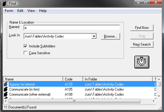 - Open the Finder Form by clicking Find in the Tools menu. The "Look In" field displays the path: Juris\Tables\Activity Codes. The Search Subfolders option is automatically checked.